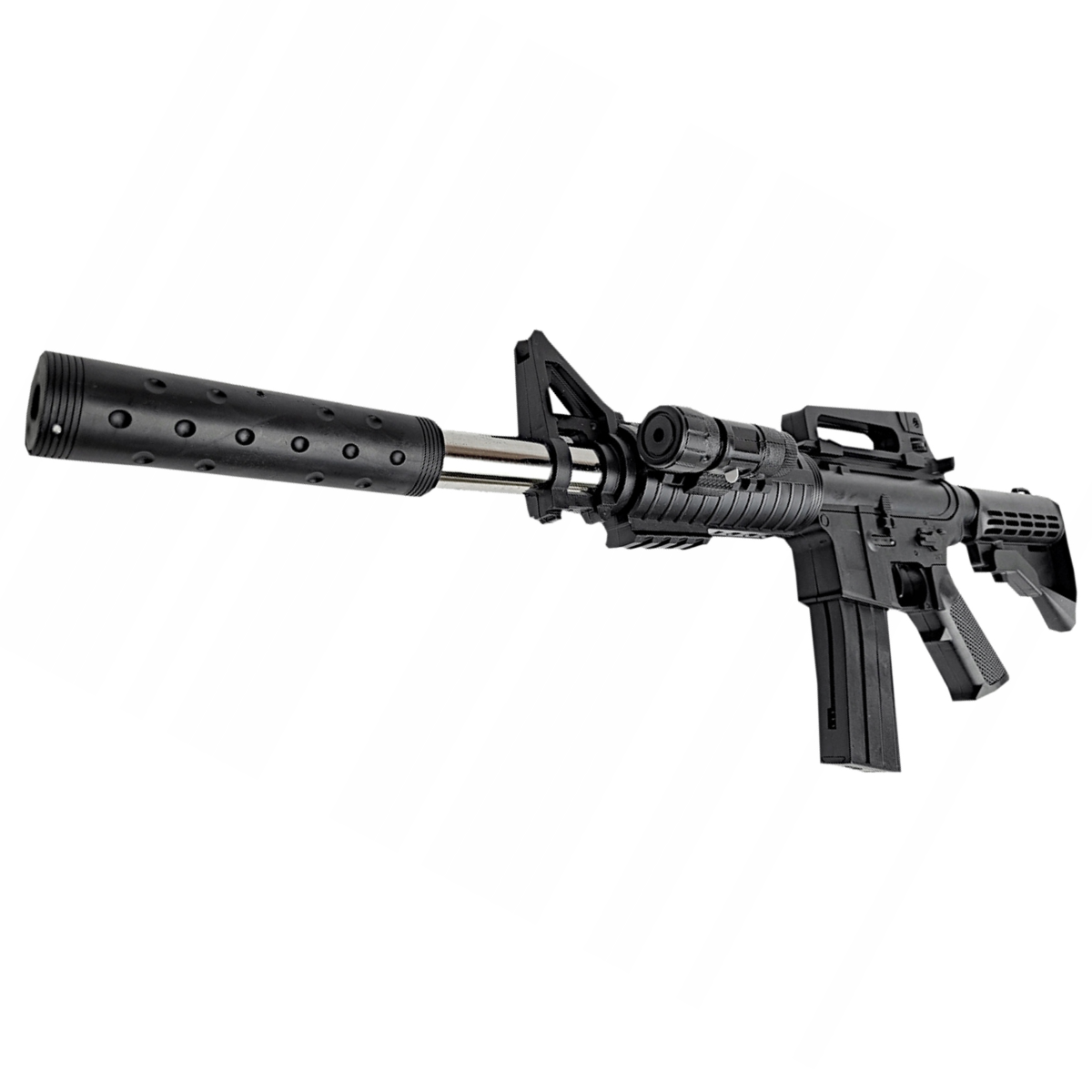 Karabin strzela lekkimi plastikowymi kulkami, co sprawia, że zabawa jest dynamiczna i emocjonująca.