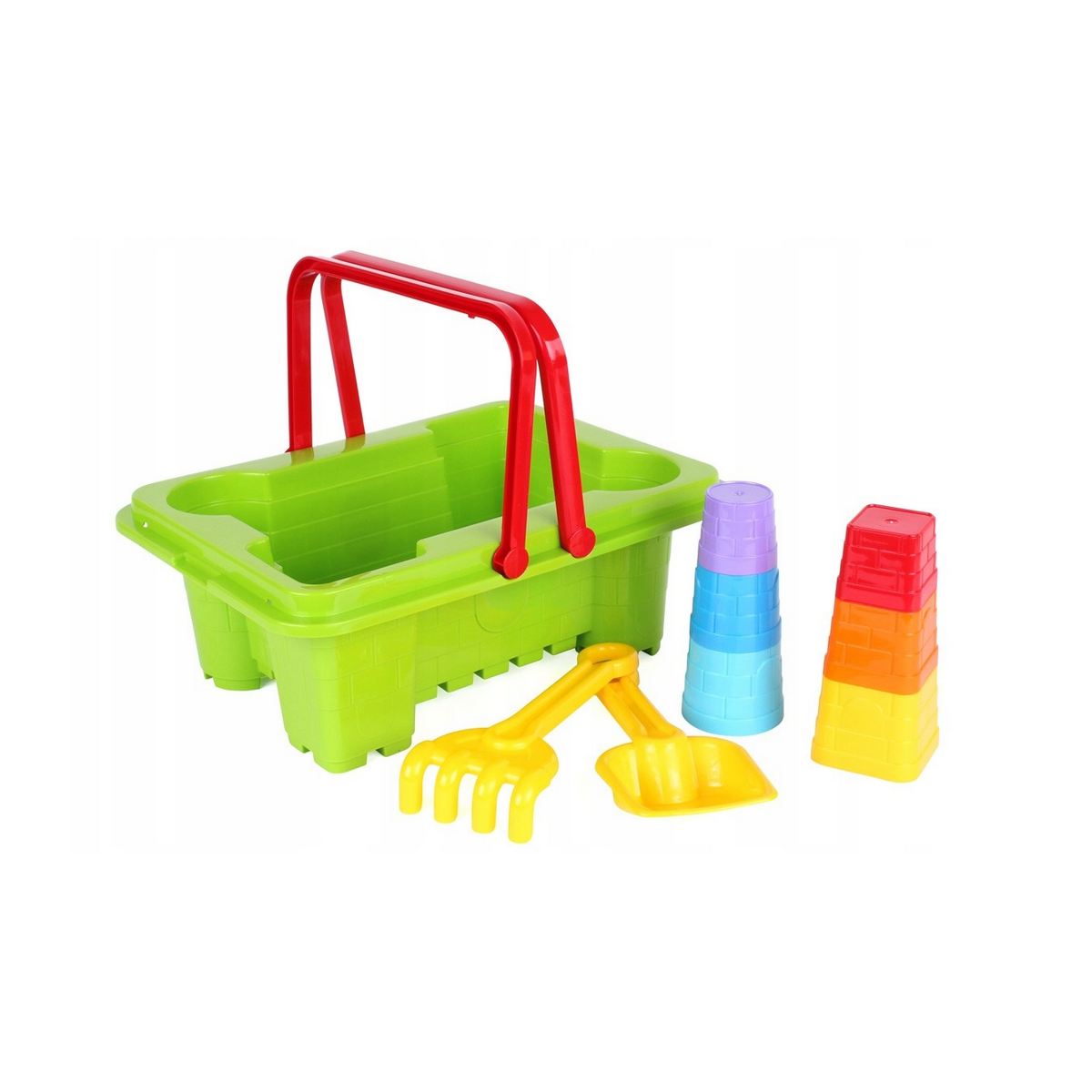W zestawie znajduje się wiaderko z motywem zamku, grabki, łopatka oraz kubeczki, które świetnie sprawdzą się do formowania piaskowych konstrukcji. Dzięki różnorodnym elementom dziecko może tworzyć zamki, wieże i inne fantazyjne kształty.