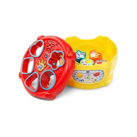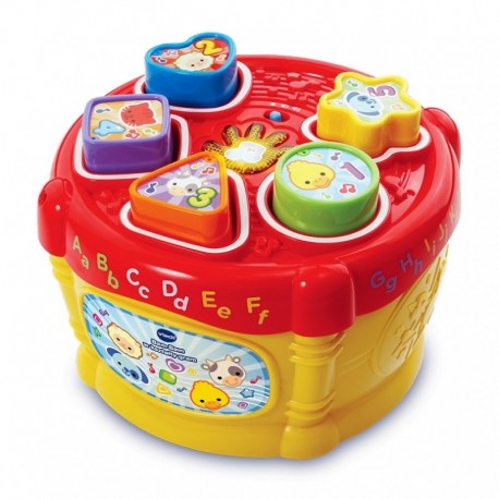 Kolorowy bębenek, na którym dziecko wybije każdy rytm Pomaga w nauce kształtów, cyfr i nazw zwierząt Dopasowanie kształtu do otworu wspomaga rozwój manualny dziecka Zdejmowane wieko bębenka umożliwia wyciągnięcie wrzuconych klocków i rozpoczęcie zabawy od nowa Możliwość zmiany stopnia czułości bębenka na uderzenia poprzez przesunięcie przełącznika znajdującego się pod jego wieczkiem